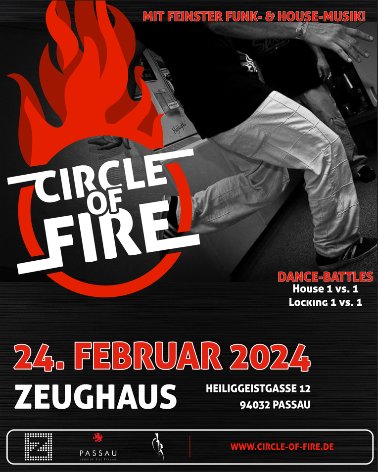 Im Kreis des Feuers, dem Battlekreis, werden sich bei der 10. Auflage des „Circle of Fire“ Tänzer*innen gewaltfrei in zweit Tanzstilen messen und dabei kreativ ihre Fähigkeiten unter Beweis stellen. Sie werden eins mit der Musik, sie werden zur Musik!